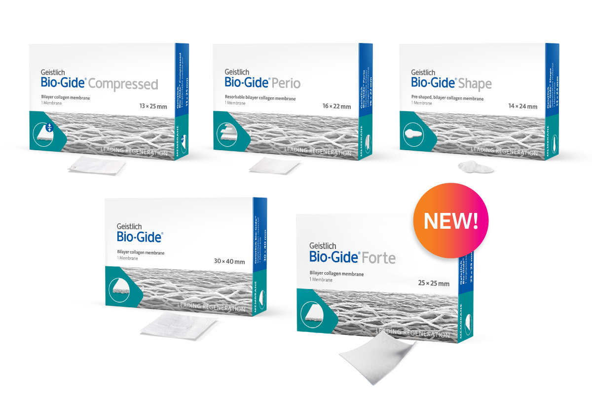 Geistlich Bio-Gide® Forte is a native collagen membrane without further cross-linking or chemical additives. Studies have shown that cross-linking of bovine and porcine-derived collagen membranes can reduce tissue integration, delay vascularization, and increase the risk of complications like foreign body reactions and dehiscence.1,2