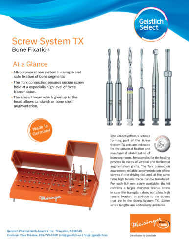 Whether used in combination with Geistlich biomaterials or within a broader regenerative protocol, the Meisinger Screws and the Screw System TX supports predictable healing and durable outcomes.