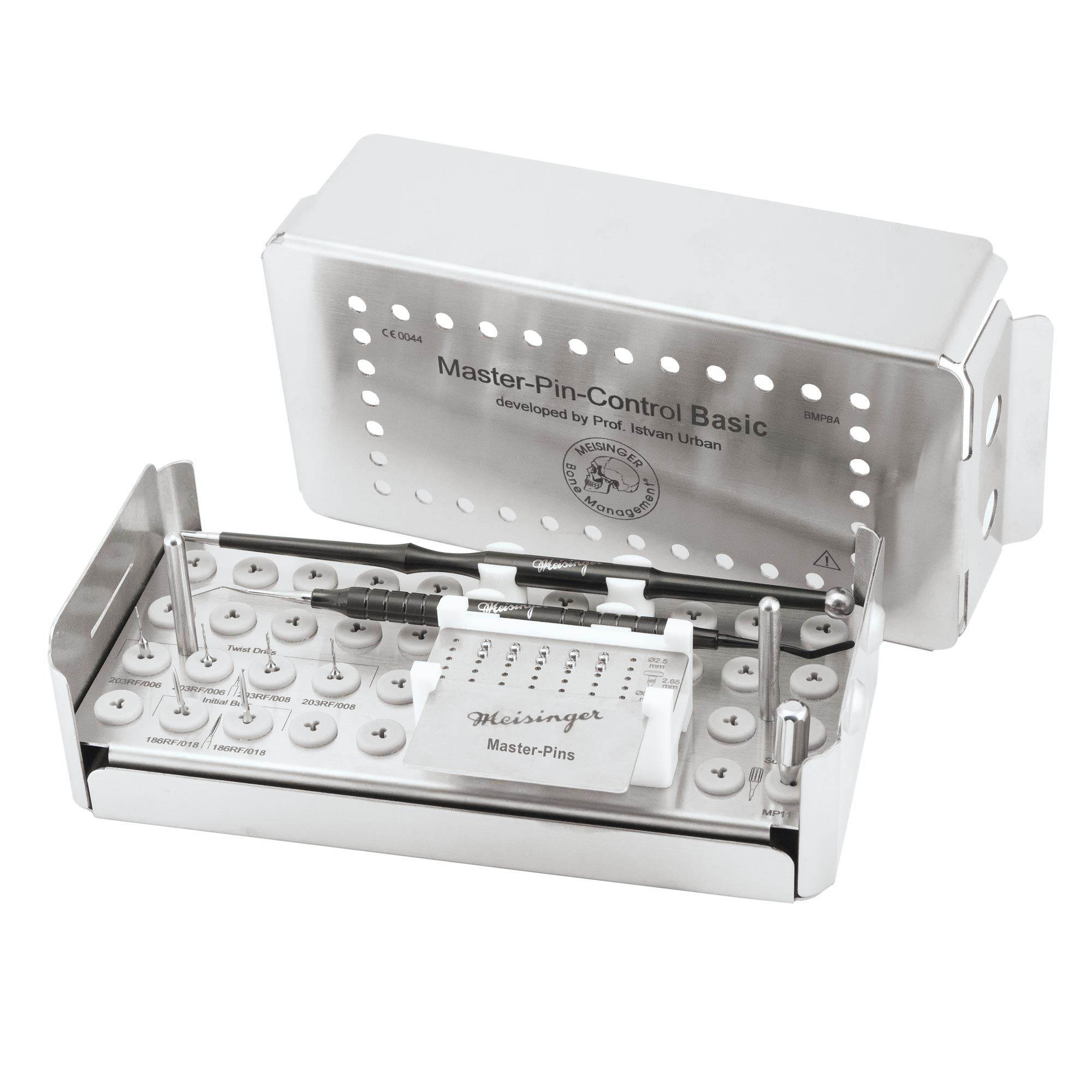 Pilot Drill (x2), Twist Drills RAL (0.6mm (x2) and 0.8mm(x2), Handheld Screwdriver, Membrane Fixation Pin Holder, Membrane Fixation Pin Release, Refill Pins (x10)