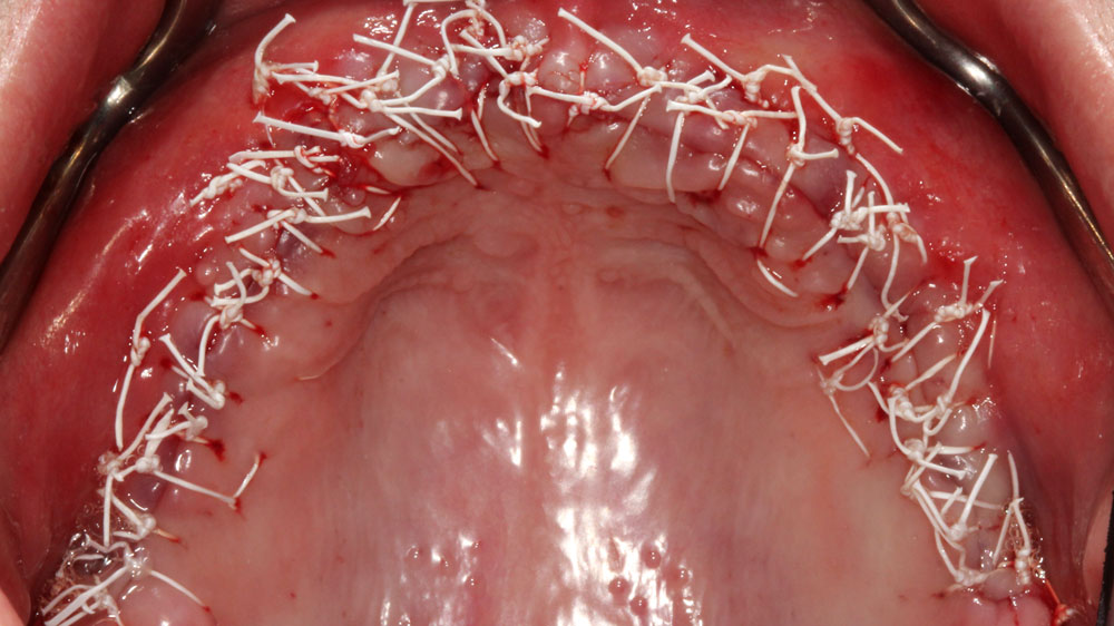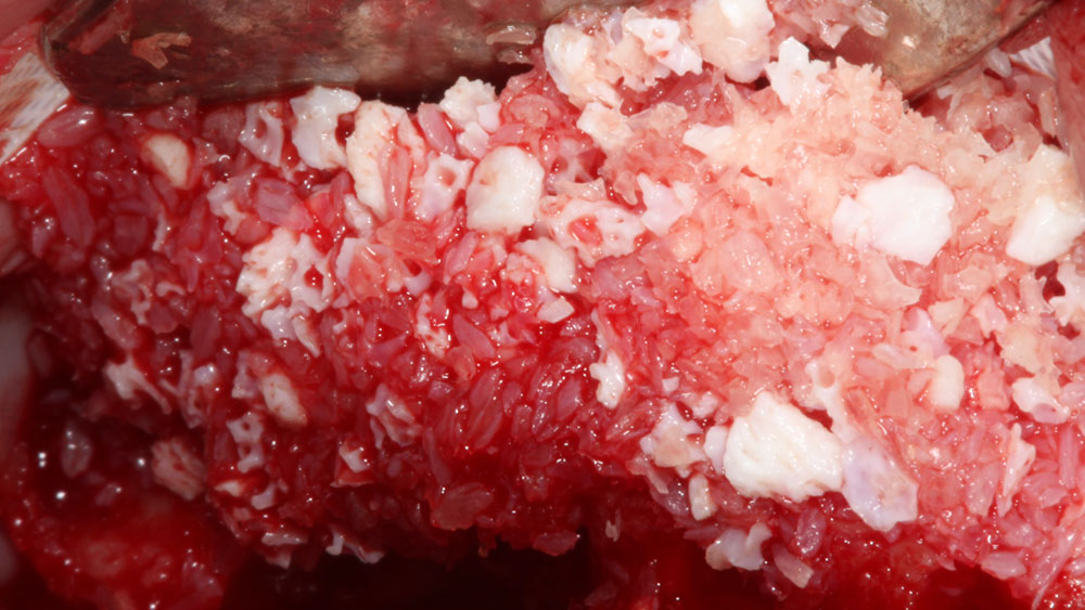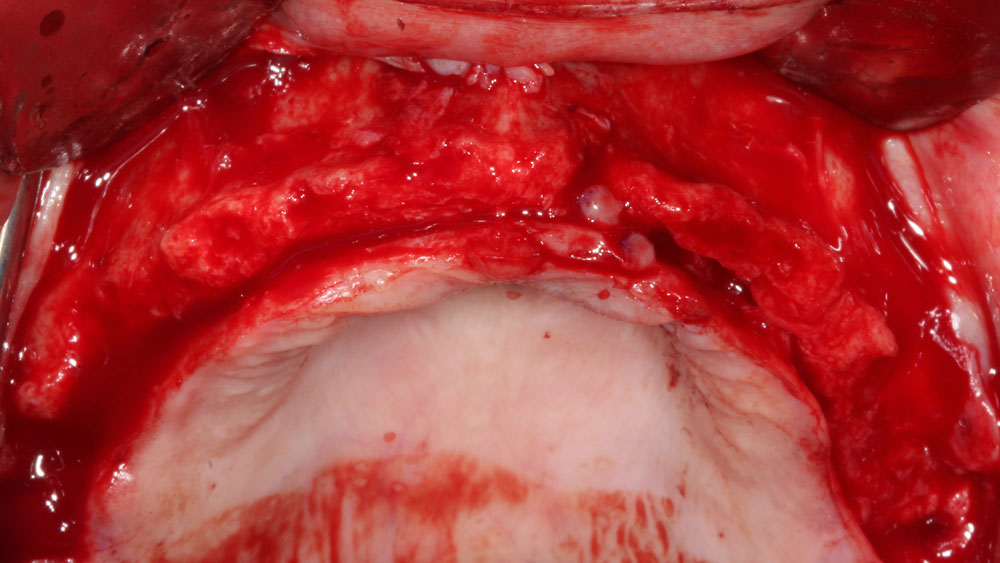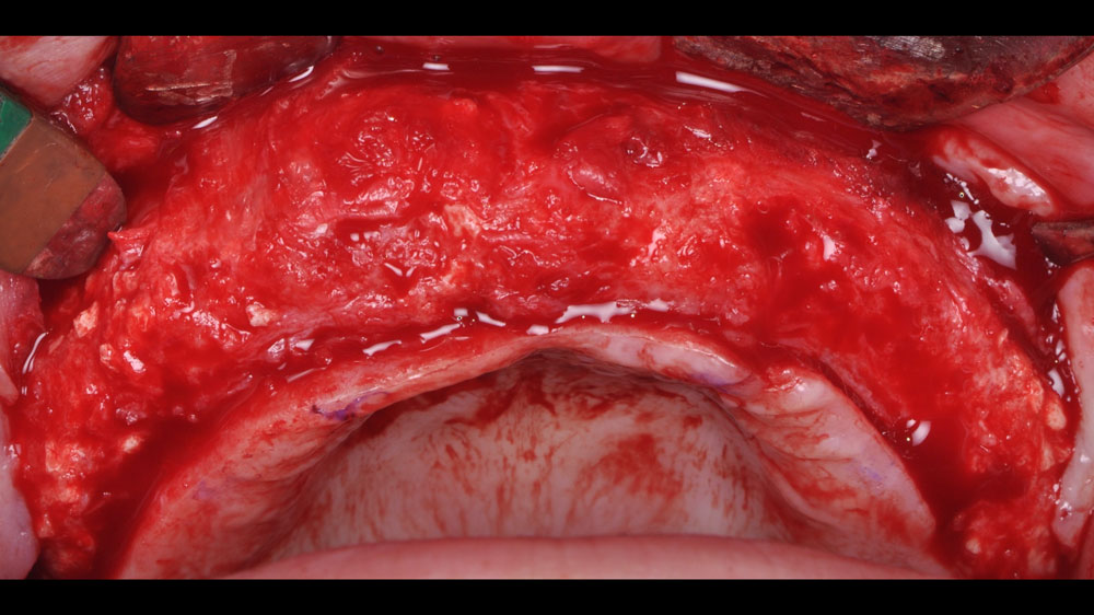 Horizontal and vertical ridge augmentation was performed using a full-thickness maxillary flap with two distal vertical releasing incisions. Extensive buccal periosteal release and cortical perforations were carried out. A composite graft of large-particle vallos® allograft (demineralized cortical granules) and large-particle Geistlich Bio-Oss® xenograft, combined with rhPDGF-BB, a component of GEM 21S®, was placed and stabilized under a high-density PTFE membrane, which was secured with four horizontal mattress and multiple simple interrupted 4-0 PTFE sutures.