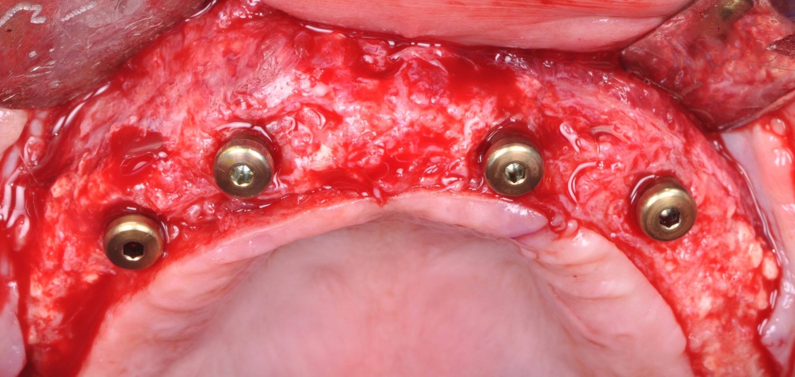Horizontal (5–7 mm) and vertical (3–4 mm) ridge augmentation were successfully obtained, with stablewound management achieved through precise suturing techniques. The osteoinductive properties of the large vallos®, demineralized granules combined with rhPDGF-BB, a component of GEM21S® promoted high-quality bone regeneration, whereas the large Geistlich Bio‑Oss®, xenograft particles contributed to volume preservation by moderating resorption. As a result, four 4.3 mm implants were placed with high primary stability, each exceeding 35 N·cm of insertion torque, providing a strong foundation for a predictable esthetic and functional restoration.